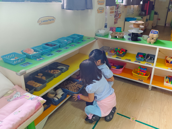 Just like a tinkerer, preschool students, then, collect the resources they need for their creations. Fortunately, through Loose Parts Play, a regular corner can turn into a tinkering studio. “The loose parts are part of the classroom resources, environment, so we allot shelves,” Teacher Dang said. For Loose Parts Play, children can make use of everyday materials: both natural and synthetic. Natural loose parts can be driftwood, sticks, shells, dry leaves, twigs, dried or fresh flowers. Synthetic loose parts include cups, lids, spools, small plastic or glass containers. To make the creative workflow easier for the pupils, the shelves that are too low for adults are within reach for the pupils. The corner is well-labelled and the loose parts are sorted accordingly. “They are well-labeled, and we introduced them to the students, telling them they can work on it during discovery time and exploration,” Teacher Dang continued.